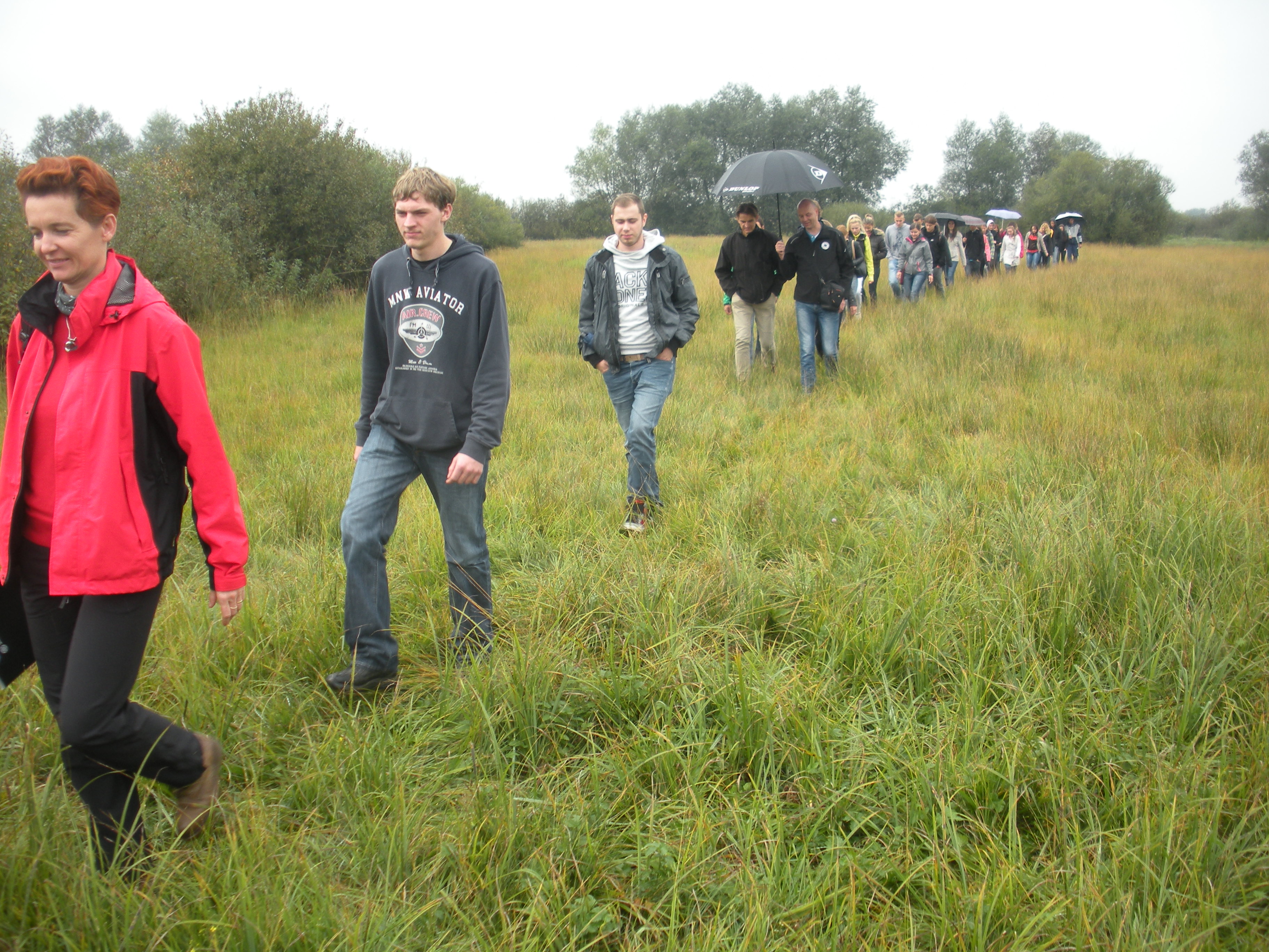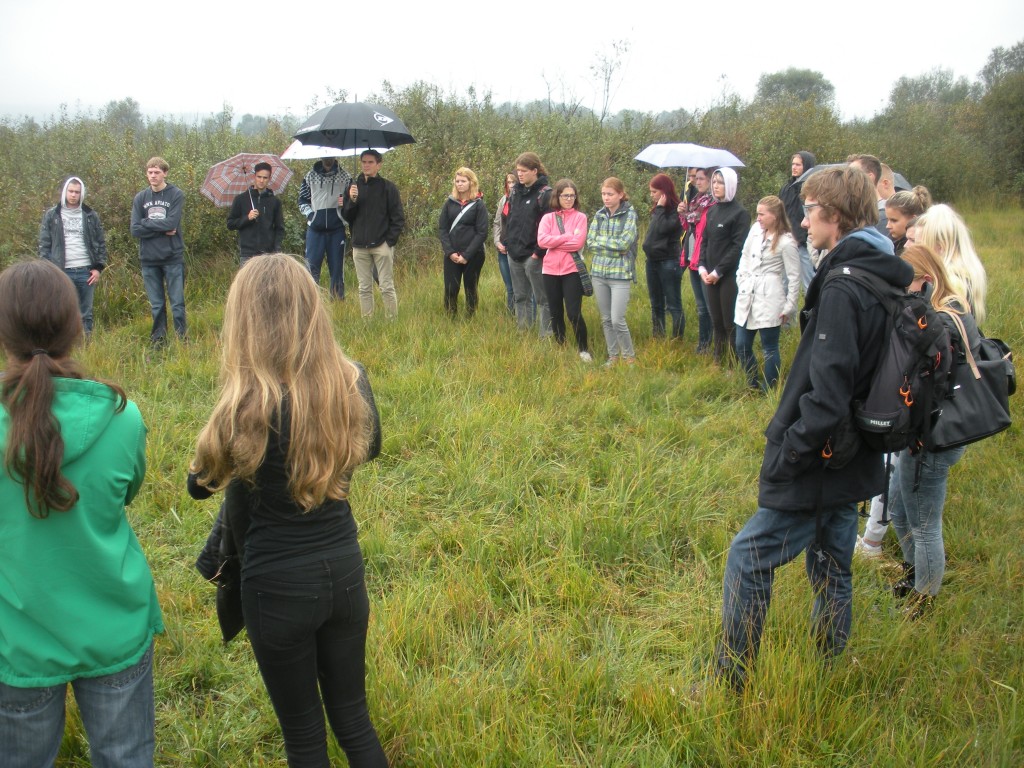 Dijaki so v učilnici poslušali uvodno predstavitev projekta LJUBA in dobili kratka navodila za delo. Nato smo se peš odpravili na travnike v bližini šole. Tam so se dijaki razdelili v skupine po štiri in na vnaprej določenih popisnih ploskvah izvedli dve praktični nalogi – popis vrstne in ekološke raznolikosti travnikov ter popis raznolikosti habitata in invazivnih tujerodnih rastlin. Zatem so si na primeru zaraščanja travnikov ogledali stopnje sukcesije ekosistema. Barjanski travniki so po celonočnem dežju pokazali svoj pravi mokrotni značaj, a kljub nizkim oblakom, ki so ves čas obetali nove dežne kaplje, smo terenski del uspeli izpeljati brez dežnikov in pelerin.