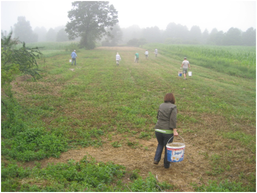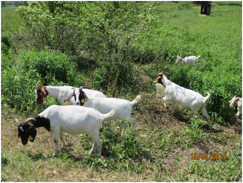Na manjši, močno zapleveljeni površini smo uredili pašnik za koze, ki so temeljito in uspešno popasle vso zarast. Ostale površine smo mulčili ali pa pokosili v času tik pred cvetenjem zlate rozge.